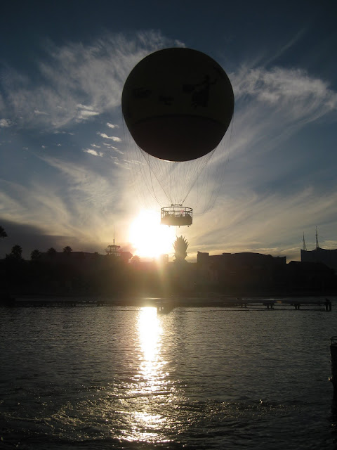This is the helium hot air balloon clicked against the setting sun in the Disney downtown of Orlando, Florida on a pleasant winter evening.